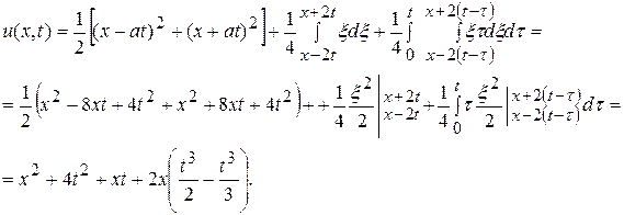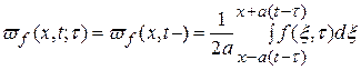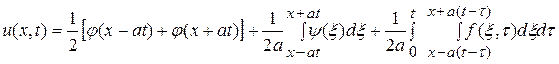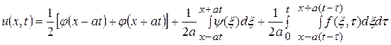 Это формула Даламбера, которая дает решения задачи Коши для неоднородного волнового уравнения.