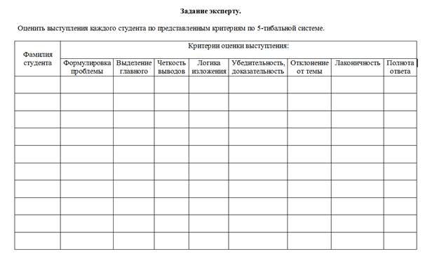 Определяются ответственные из группы, которые в зависимости от задания заполняют таблицу оценки выступлений студентов.