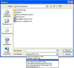 Выбрав нужную папку и открыв ее, можно просмотреть, есть ли в ней нужные файлы - они размещаются в большом окне диалогового окна. Если нужный файл обнаружен, его можно выделить и открыть, щелкнув кнопку Открыть. При этом файл загружается в окно редактора WordPad, и его можно редактировать, печатать и т.п. Как видно на рис. 3, диалоговое окно имеет также переключатель типов файлов и кнопку-команду Отмена для отказа от загрузки выбранного файла.