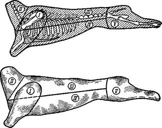 I – лопатка (передняя нога); II – шейная часть; III – корейка; IV – грудинка; V – тазобедренная часть.