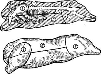 V – тазобедренная часть (задняя нога); VI– вырезка.