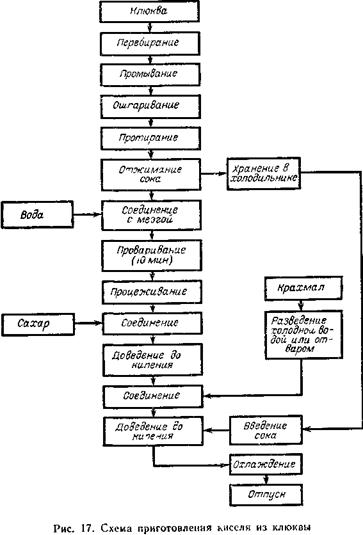 Кисель из свежих ягод. Приготавливают из клюквы (рис. 17), черники, брусники, смородины черной или красной и других ягод. Ягоды перебирают, промывают кипяченой водой, разминают деревянным пестиком, а большое количество протирают с помощью протирочной машины и отжимают сок, который помещают в неокисляющуюся посуду и ставят в холодильник. Мезгу заливают горячей водой (1:6) и проваривают 10–15 мин. Полученный отвар процеживают, вводят в него сахар, растворяют, получают сироп и нагревают до кипения. Картофельный крахмал разводят холодной кипяченой водой или частью полученного отвара (1:5) и вливают одним приемом в кипящий сироп при энергичном размешивании. Кисель доводят до кипения, проваривая не более 1–2 мин, так как более длительное кипячение разжижает кисель, снимают с огня, вливают, помешивая, сок, который придает киселю цвет, вкус и запах свежих ягод. Кисель слегка охлаждают и разливают в стаканы или креманки, поверхность посыпают сахаром, затем окончательно охлаждают до 10–14 °С и отпускают.