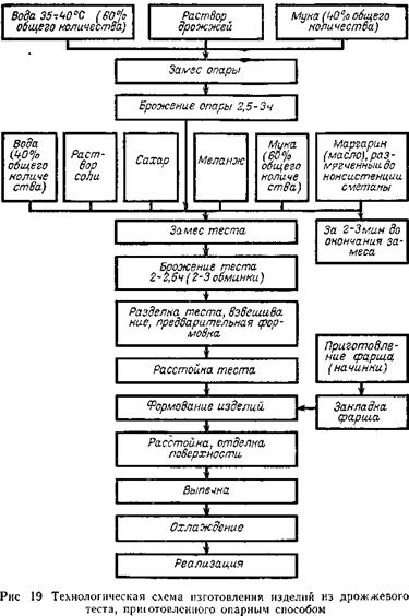 Приготовление опарного теста. В готовую опару добавляют оставшуюся жидкость с растворенными в ней солью и сахаром, вымешивают до полного соединения жидкости с опарой и вводят остаток просеянной муки и яйца. Тщательно перемешивают в течение 10–15 мин. В конце замешивания добавляют масло. Затем тесто ставят в теплое место для брожения на 1,5–2 ч. За это время производят одну-две обминки (рис. 19).