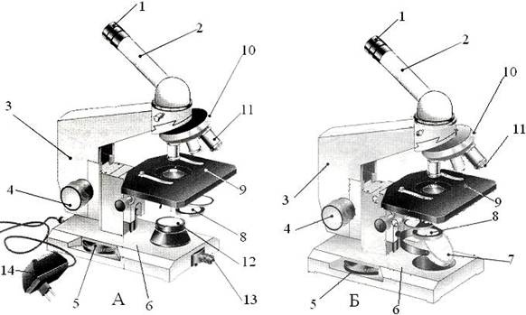 В рабочей тетради укажите названия элементов светового микроскопа, соответствующие цифрам на рисунках: