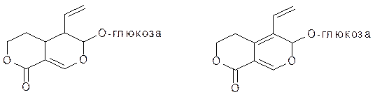 3. Секоиридоиды группы генциопикрозида (генциопикрина ) содержатся в растениях семейств: Gentianaceae, Menyanthaceae, Loganiaceae, Apocynaceae, Caprifoliaceae, Oleaceae. Представителями этой группы являются сверозид и его производные (амарогентин, амаросверин), сверциамарин, генциопикрозид и его производные (эритроцентаурин и др.)