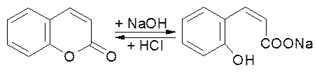 5. Одним из самых характерных свойств кумаринов как лактонов является их специфическое отношение к щелочам. Раскрытие лактонного кольца происходит лишь при воздействии разбавленной щелочи при нагревании, но при подкислении кольцо вновь замыкается, образуя исходный кумарин.