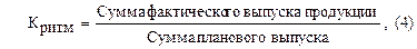 - Коэффициент ритмичности (Крит.). Он определяется (с использованием метода зачета) отношением фактического (но не выше планового задания) выпуска продукции (или ее удельного веса) - VВП1 к плановому выпуску (удельному весу) - VВП0