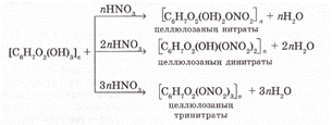 Реакцияға бір, екі, үш гидроксил топтары қатысуы мүмкін. Реакцияны жүргізу жағдайына байланысты целлюлозаның әр түрлі нитраттары алынады: