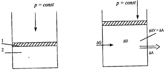 Термодинамикалық жүйе ретінде цилиндрдің поршені (1) астында орналасқан газды (2) аламыз. Жылжымалы поршень цилиндр қабырғасын бойлай үйкеліссіз орын ауыстырады. Бастапқы күйде газдың температурасы қоршаған ортаның температурасына тең. Поршеньге түсетін ішкі және сыртқы қысым (Р) бірдей болғандықтан, поршень тыныштықта тұрады. Газға біраз жылу мөлшерін берейік. Газ ұлғая бастайды және поршень Dh қашықтыққа жоғары көтеріледі. Газдың бастапқы және соңғы көлемдерін V1 және V2 деп белгілейік. Сонда поршень ауданының, оның орын ауыстыруына көбейтіндісі газ көлемінің өзгеруіне тең: