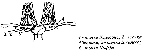 Точка Вильсона расположена ниже ключицы на среднеднеключичной линии. Направление пункции ПВ – между ключицей и 1ребром в роекцию ремной вырезки. Точка Джилеса определяется на 2 см кнаружи от грудины и на 1 см ниже ключицы. Ход иглы должен быть за ключицей в проекцию верхнего края грудинноключичного соединения.