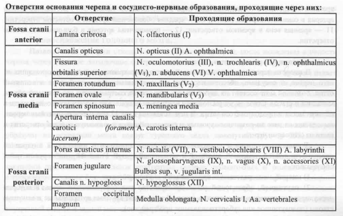 В образовании основания черепа принимают участие шесть костей: лобная, решетчатая, клиновидная (или основная), две височные и затылочная. Принято выделять три черепные ямки: переднюю (от внутренней поверхности чешуи лобной кости до крыльев и площадки основной кости), среднюю (область пирамид височных костей), заднюю (от спинки турецкого седла до задних граней пирамид височных костей и борозды поперечного синуса).