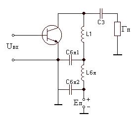 Для защиты питания применен П - образный фильтр, состоящий из конденсатора Сбл1, Сбл2 и блокировочного дросселя Lбл. Нагрузка rп одним концом соединена с «землей». Простейшая цепь согласования (ЦС) – контуром L1C3rп. Схемы последовательного питания близки к идеальным при рациональном выборе блокировочных элементов. Но применять их можно с такими ЦС, в которых имеется путь для постоянной составляющей выходного тока АЭ.