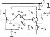 Схема автогенератора (рис. 5.6), работающего на заданной механической гармонике кварцевой пластины, аналогична схеме генератора на рис. 5.5,б; отличие — включение в цепь между коллектором и эмиттером транзистора колебательного контура, собственная частота которого несколько ниже рабочей частоты резонатора. Для основной частоты и гармоник, более низких, чем заданная, контур L1 С2 представляет собой индуктивное coпротивление. При этом условия самовозбуждения не выполняются и колебаний в системе не возникает. Для заданной частоты гармоники контур представляет собой емкостное сопротивление; тогда схема генератора — емкостная трехточка. Для более высоких гармоник условия самовозбуждения, как правило, не выполняются. При работе резонатора на гармониках механических колебаний емкость Ск эквивалентного последовательного контура становится небольшой, при этом начинает сказываться шунтирующее действие емкости между выводами резонатора Со. Поэтому для получения стабильных колебаний на очень высоких частотах необходимо устранить влияние большой емкости Со. Для этих целей в автогенераторах предусматривают цепь нейтрализации емкости Со, которая создает в схеме ток, равный по величине и противоположный по знаку току через Со. Этого можно достигнуть, например, включением параллельно кварцевому резонатору индуктивной катушки.