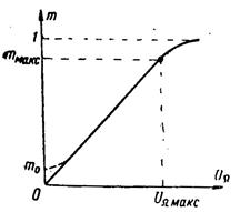 Динамическая модуляционная (или амплитудная) характеристика показывает зависимость глубины модуляции от амплитуды модулирующего напряжения. Вид характеристики примерно одинаков для всех способов AM и показан на рисунке: