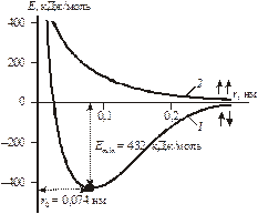Образование химической связи – процесс энергетически выгодный, сопровождается выделением энергии. Это подтверждено квантово-механическим расчетом взаимодействия двух атомов водорода при образовании молекулы (Гейтлер, Лондон). По результатам расчета выведена зависимость потенциальной энергии системы Е от расстояния между атомами водорода r (рис. 4.1).