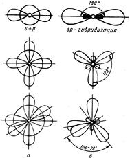 § 3. Гибридизация атомных орбиталей и пространственное строение молекул. Часто атомы формируют связи за счет электронов разных энергетических состояний. Так у атомов бериллия Ве (2s12р1), бора В (2s12р2), углерода С (2s12р3) в образовании связей принимают участие s- и р-электроны. Несмотря на то, что s- и р-облака отличаются по форме и энергии, химические связи, образованные с их участием, оказываются равноценными и расположены симметрично. Возникает вопрос, каким образом неравноценные по исходному состоянию электроны образуют равноценные химические связи. Ответ на него дает представление о гибридизации валентных орбиталей.