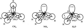 Дело в том, что центральные атомы этих молекул, соответственно, атомы С, N и О образуют химические связи за счет sр3-гибридных орбиталей. У атома углерода на четыре sр3-гибридных орбитали приходится четыре неспаренных электрона. Это определяет образование четырех связей С-Н и расположение атомов водорода в вершинах правильного тетраэдра с валентным углом 109°28¢. У атома азота на четыре sр3-гибридных орбитали приходится одна неподеленная электронная пара и три неспаренных электрона. Электронная пара оказывается несвязывающей и занимает одну из четырех гибридных орбиталей, поэтому молекула Н3N имеет форму тригональной пирамиды. За счет отталкивающего действия несвязывающей электронной пары валентный угол в молекуле NH3 меньше тетраэдрического и составляет 107,3°. У атома кислорода на четыре sр3-гибридных орбитали приходится две несвязывающие электронные пары и два неспаренных электрона. Теперь уже две из четырех гибридных орбитали заняты несвязывающими электронными парами, поэтому молекула Н2О имеет угловую форму. Отталкивающее действие двух несвязывающих электронных пар проявляется в большей степени, поэтому валентный угол искажается против тетраэдрического еще сильнее и в молекуле воды составляет 104,5° (рис. 4.3.).