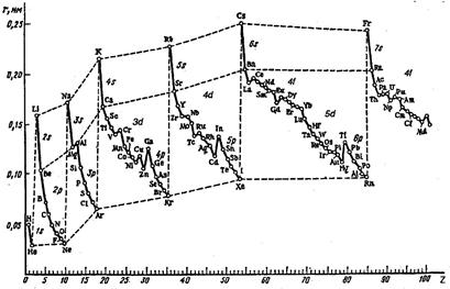 Рис. 6.2. Зависимость орбитальных радиусов атомов от атомного номера элемента.