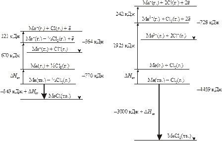 Рассмотрим возможности цикла Борна – Габера на примере хлоридов (MeCl) и дихлоридов (MeCl2) металлов. Величина U рассчитывается на основе закона Гесса (с использованием старых единиц – ккал).