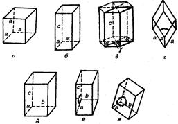 | Рис. 18.7. Основные кристаллические сингонии: а – кубическая (a = b =c, α=β=g=90°); б – тетрагональная (а = b ¹ с, α=β=g=90°); в – гексагональная (а = b ¹ с, a=b=90°, g=120°); г – ромбоэдрическая (а = b = с, a=b=g¹90°); д – орторомбическая (а ¹ b ¹ с, a=β=γ=90°); е – моноклинная (а ¹ b ¹ с, a=γ=90°, β¹90°); ж – триклинная (а ¹ b ¹ с, a¹b¹g¹90°). | |