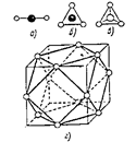 Рис. 18.8. Координационные многогран-ники: а – гантель, б – треугольник, в – тетраэдр, г – кубооктаэдр.