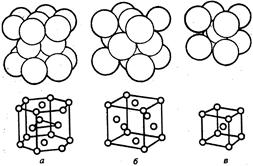 | Рис. 18.10. Изображение упаковки шаров и типы металлических структур: а – гексагональная; б – кубическая гранецентрированная; в – кубическая объемно-центрированная. | |