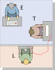 Экспериментатор (E) требовал от «учителя» (T) давать «ученику» (L) простые задачи на запоминание и при каждой ошибке «ученика» нажимать на кнопку, якобы наказывающую «ученика» ударом тока (на самом деле актёр, игравший «ученика», только делал вид, что получает удары). Начав с 45 В, «учитель» с каждой новой ошибкой должен был увеличивать напряжение на 15 В вплоть до 450 В.