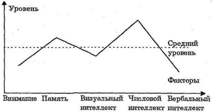 них параметров изображаются подъемами на ломаной линии-графике, а пониженные значения — спадами на этой линии. Состав параметров и форма диагностограмм зависят от области деятельности и конкретной задачи, ради решения которой проводится психодиагностика. В педагогической психологии диагностограммы могут быть сфокусированы на психических свойствах, наиболее значимых для развития учебной деятельности. На рис. 2 дается пример такой простейшей профильной диагностограммы.