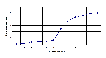 Процедуру вычисления квартилей можно проиллюстрировать графически. Для этого необходимо вычислить проценты накопленных частот суждения Si. Затем нужно построить прямоугольную систему координат, в которой по оси абсцисс откладываются 11 интервалов шкалы, а по оси ординат — проценты накопленных частот. Кривая накопленных процентов — кумулята — пройдет через 11 точек, для каждой из которых координатой по оси абсцисс будет верхняя граница соответствующего интервала, а по оси ординат — количество процентов накопленных частот для данной градации шкалы. Значение медианы можно получить, опустив перпендикуляр на ось абсцисс через 50-й процент на оси ординат. Если провести прямые параллельно оси абсцисс через 25-й и 75-й проценты на оси ординат, то, опустив перпендикуляры из точек пересечения этих прямых с кумулятой на ось абсцисс, получим значения соответственно первого и третьего квартилей.