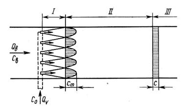 Участок водоёма или водотока от места выпуска сточных вод до сечения, где произойдет их полное перемешивание, условно разделяют на три зоны (рис. 13) [47, 49]: