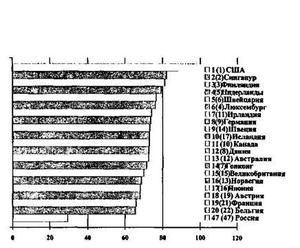 Не удивительно, что, по данным отчета Всемирного экономического форума "Глобальная конкурентоспособность-2000", подготовленного совместно с профессорами Гарвардского университета, пятерку самых конкурентоспособных государств составляют Финляндия, США, ФРГ, Нидерланды и Швейцария, а в пятерку самых перспективных по потенциалу роста входят США, Сингапур, Люксембург, Нидерланды и Ирландия. В рейтинг-листе нынешней конкурентоспособности Россия находится на 52-м месте из 58, уступая Сальвадору, но опережая Вьетнам. В рейтинг-листе потенциала рос-та наша страна заняла только 55-е место, пропустив вперед Ни дне позиции Вьетнам и опережая только Зимбабве, Украину, Болгарию и Эквадор1.