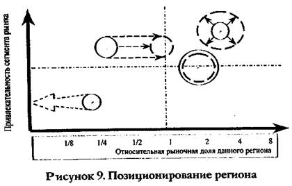 Одна из исходных и определяющих функций маркетинга регионов— это их позиционирование среди других регионов, а также на международных рынках сбыта. Оно помогает регионам и центру увидеть, на каких направлениях деятельности и рынках сбыта данному региону целесообразно играть роль лидера отечественной экономики, на каких — действовать в режиме партнерства, а с каких — уйти. Такое позиционирование предполагает выявление пропорций между объемами продаж ведущих (определяющих/лицо" региона) групп товаров на конкретных рынках сбыта в сравнении с ведущим регионом-конкурентом, а также определение перспективности активных усилий на конкретных рынках в связи с уровнем их валового внутреннего продукта на душу населения и долей в структуре продаж (потребления) регионального товара, с учетом уровня развития рыночной и социальной инфраструктуры. Модель позиционирования отображена на рис. 10.