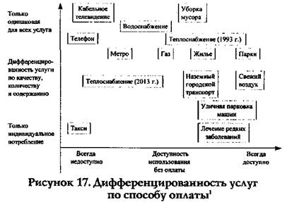 Второй критерий, важный с точки зрения городского управления,— возможность получения услуги населением без соответствующей оплаты. Этот критерий характеризует как степень контролируемости потребления со стороны городских служб, возможность успеха попытки несанкционированного доступа пользователя к услуге, так и степень освобождения индивидуального потребителя от оплаты при предоставлении услуги. Этот критерий также может быть упорядочен, но шкала измерений оказывается /весьма грубой. Крайние случаи здесь — полная недоступность услуги без адекватной оплаты и полная доступность ее без оплаты (см. ту же схему).