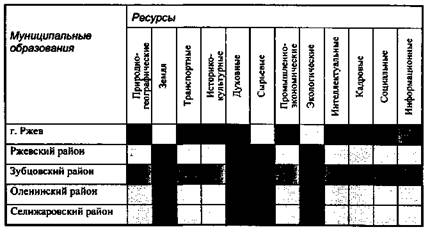 Вот какая форма позиционирования пяти взаимодействующих муниципальных образований предложена отделом маркетинга г. Ржева (Тверская область). Муниципальные образования сопоставлены по ресурсным составляющим будущей стратегии (см. рис. 19). На базе результатов, полученных на всех этих этапах, формируется собственно стратегия и составляется план развития города (см. приложение 1.)