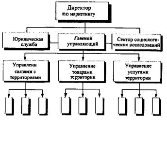 Но заботы и аспекты деятельности территории сами по себе весьма разнообразны, прежде всего в связи с широчайшим ассортиментом товаров и услуг, которые территория способна предложить для обмена и в которых она нуждается. Поэтому базовая структура может быть ориентирована на иной принцип разделения труда и ответственности, в частности по объектам маркетинга— товарам.