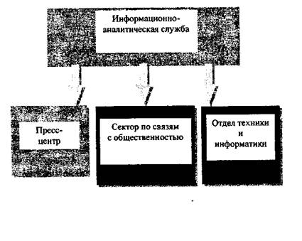 Если маркетинговая служба (как бы она ни называлась) является подразделением администрации главы территориального образования, она, безусловно, обслуживает преимущественно, если не в основном, интересы территориальной власти и часто выполняет преимущественно коммуникационные функции, отвечая за связи с общественностью. Она может функционировать в составе информационно-аналитического управления, но решает достаточно частные задачи, не распространяя свою деятельность на возможные рынки продвижения товаров и услуг территории. Один из примеров — структура, появившаяся несколько лет назад в структуре власти г.Анжеро-Судженска (Кемеровская область) (см. рис. 20). Основными функциями указанного на схеме сектора общественных связей определены: