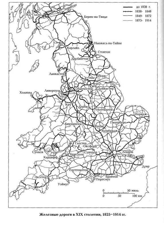 В 30-х годах на развитие железных дорог оказал влияние еще один спекулятивный бум. К 1840 г. около 2400 миль железнодорожных линий связывали Лондон с Бирмингемом, Манчестером и Брайтоном. Некоторые из линий процветали, другие – обремененные чрезмерной капитализацией и различными судебными тяжбами – находились в плачевном состоянии. В дни возникновения первых акционерных компаний действовало совсем немного правил, и репутация предпринимателей, сумевших обменять «бумажки на золото», была очень высокой, как, например, у Джорджа Хадсона, «железнодорожного короля», контролировавшего к 1845 г. треть всей сети железных дорог.