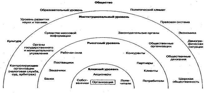В современной научной литературе, посвященной изучению организаций, наиболее распространена концепция четырех уровней. Согласно этой концепции, во внешней среде любой организации целесообразно выделять четыре уровня, каждый из которых имеет свои особенности воздействия на деятельность организации. Рассмотрим последовательно особенности уровней внешнего окружения.