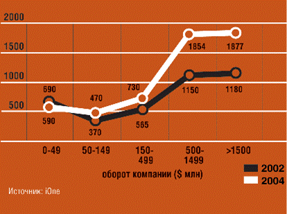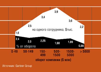 На ней корпоративные ИТ-бюджеты, выраженные в процентах от оборота компании, а также в расчете на одного штатного сотрудника, представлены в разрезе масштаба бизнеса (оборота предприятия). Получается, что чем крупнее компания, тем меньший процент от своего оборота она тратит на ИТ. Удельные же затраты на ИТ оказываются более высокими для средних компаний. Отсюда правило: «Если ваш бизнес растет, и бизнес-модель не меняется, то, предположительно, вы сможете тратить меньший процент от оборота на ИТ, чем в предыдущие годы». ¶¶Следуя примеру Gartner, мы представили данные по корпоративным ИТ-бюджетам российских предприятий в аналогичном виде. Еще по результатам предыдущего исследования (по данным 2002 года) картина выглядела иначе: средние предприятия явно отставали по затратам на ИТ (в любых единицах измерения) от мелких и тем более крупных. Мы объяснили это переходным состоянием по автоматизации в российском корпоративном секторе. Волна современной автоматизации идет со стороны крупных предприятий, затраты на ИТ которых относительно велики, средние же предприятия одолевали другие заботы. Характер распределения, построенного по данным 2004 года, качественно не изменился, однако оно показывает, что волна автоматизации постепенно захватывает и средние предприятия (рис. 9.3 и 9.4).