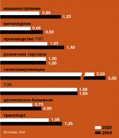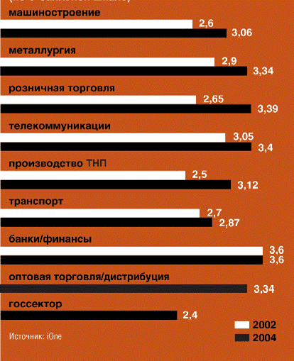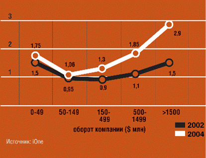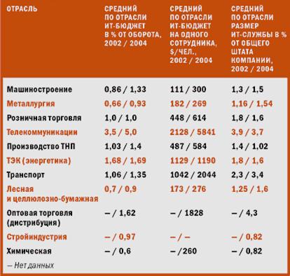 Отметим, во-первых, общее повышение уровня автоматизации российских предприятий по сравнению с результатами 2002 года, а во-вторых, существенный прогресс средних предприятий. На этом фоне в провале остается все тот же сектор средне-малых компаний. В дальнейшем относительная величина затрат на ИТ у крупных предприятий будет снижаться (от внедрения ИТ-решений -- к их поддержке). Средним же организациям, которые должны тратить на автоматизацию больше в относительном выражении, но пока этого не делают, придется пересмотреть структуру внутренних инвестиций в пользу ИТ -- конкуренция заставит. В целом распределение ИТ-затрат будет стремиться к той стационарной картине, которую зафиксировала для западных рынков Gartner. Средняя по исследуемой выборке компаний величина корпоративного ИТ-бюджета в 2004 году составила 1,34% от оборота. Два года назад было 1,07%. В отраслевом разрезе, разумеется, есть отклонения в ту и другую сторону. Отметим прогресс машиностроительных предприятий и производителей ТНП: увеличив за последние два года инвестиции в ИТ, они заметно повысили уровень своей автоматизации (рис. 9.6, 9.7; табл. 9.1, 9.2)