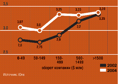 Особенно заметные изменения за последние два года произошли в секторе средне-крупных организаций. Самым проблемным остается сектор средне-малых предприятий (с оборотом $50–150 млн) -- здесь никаких подвижек за два года не случилось. В этом секторе большое представительство имеют небольшие машиностроительные предприятия и производители пищевых и прочих потребительских продуктов. В самом крупном корпоративном секторе (оборот более $1,5 млрд) значения затрат на ИТ (в процентах от оборота) несколько завышены, поскольку в исследовании 2004 года в этой категории преобладали крупные телекоммуникационные фирмы, которые традиционно много тратят на ИТ. Каковы затраты -- таковы и результаты. Уровень автоматизации тех предприятий, которые увеличили свои инвестиции в ИТ, тоже повысился. Уровень автоматизации мы оценивали по ответам респондентов на вопросы о степени автоматизации основных бизнес-процессов: бухгалтерский и финансовый учет, учет материальных ресурсов, взаимодействие с поставщиками и партнерами, взаимодействие с клиентами, внутрикорпоративный документооборот, производственные процессы, учет кадров и расчет зарплаты. Процедура была вполне формализованной, ее результат -- «корпоративная оценка iOne» по пятибалльной шкале (рис. 9.5).
