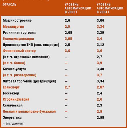 Таблица 9.2. Уровень автоматизации по отраслям (по пятибалльной шкале)