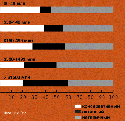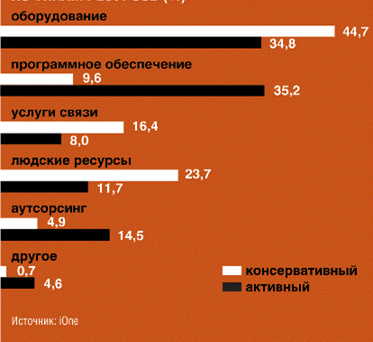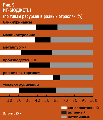 Почти половина предприятий имеет нетипичную структуру ИТ-бюджета. Нетипичность может быть связана как с переходом от одного типа к другому, так и со спецификой предприятия. Около трети компаний имеют «консервативную» структуру ИТ-бюджета, около четверти -- «активную». Во второй группе чаще встречаются телекоммуникационные фирмы, финансовые организации, металлургические предприятия (рис. 9), как правило, это крупные компании, с оборотом более $500 млн, но и средние бизнес-структуры (оборот $150–500 млн) тоже довольно активно закупают и внедряют новые ИТ-решения (рис. 9.10).