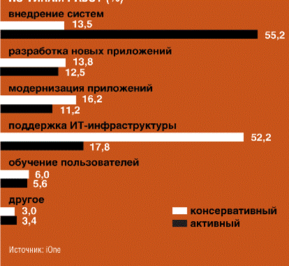 Важна не только величина корпоративного ИТ-бюджета, но структура затрат на ИТ: на какие ресурсы («железо», ПО, связь, персонал, аутсорсинг) и работы (внедрение новых систем, поддержка ИТ-инфраструктуры, обучение) компании тратят больше средств. Из ответов респондентов мы выделили два устойчивых типа бюджетных структур, характеризующих инвестиционное поведение предприятия в сфере ИТ. Первый (назовем его «активным» бюджетом) характеризуется сопоставимыми затратами на оборудование и ПО, довольно высокой долей затрат на аутсорсинг, затраты на внедрение в этом случае намного больше, чем на поддержку ИТ-инфраструктуры. Второй тип («консервативный» бюджет) ориентирован в основном на поддержание текущей деятельности: затраты на «железо» намного превосходят затраты на ПО, а на поддержку инфраструктуры тратится существенно больше, чем на внедрение новых систем (рис. 9.8 и 9.9).