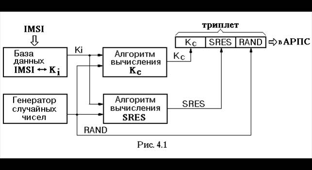 Для обеспечения аутентификации и закрытия информации при регистрации абоненту присваивается не только номер IMSI, но и индивидуальный абонентский ключ Кi , который хранится в центре аутентификации (ЦА), а также в оборудовании подвижной станции (ПС). Абонентский ключ Кi в ЦА используется для формирования триплет: ключа закрытия информации КС, маркированного отклика SRES и случайного числа RAND (рис. 4.1). Вначале генерируется случайное число RAND. Случайное