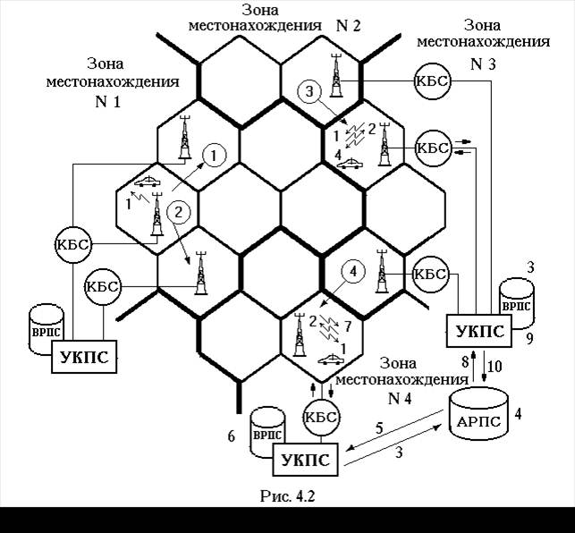 При изменении не только зоны местонахождения, но и зоны обслуживания УКПС, необходимо зарегистрировать ПС в ВРПС нового УКПС, произвести изменение данных в АРПС (HLP) и отменить запись в ВРПС прежнего УКПС. Получив по контрольному каналу новый индентификатор зоны местонахождения (1), ПС ищет доступ к сети и передает запрос на обновление данных зоны местонахождения (2). УКПС, анализируя сообщение, полученное от ПС, узнает, что данная ПС не зарегистрирована в его ВРПС. Поэтому на основании номера абонента (IMSI) УКПС обращается к АРПС, где зарегистрирован данный абонент с заявкой на обновление данных зоны местонахождения этой ПС (3), т.е. данных о зоне обслуживания УКПС. В АРПС осуществляется обновление данных (4). О произведенных действиях информируется УКПС (5), в зоне обслуживания которого в данный момент находится ПС. Получив подтверждение, УКПС производит регистрацию ПС в ВРПС (6) и передает ПС подтверждение об обновлении данных местонахождения (7). Кроме того, АРПС после обновления данных обращается с заявкой к УКПС, в зоне обслуживания которого находилась ПС, на отмену записи регистрации ПС в ВРПС (8). УКПС обеспечивает отмену записи регистрации ПС в ВРПС (9) и передает в обратном направлении сообщение подтверждения о произведенных действиях (10).
