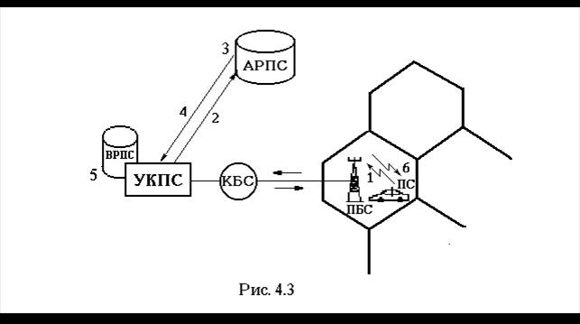 В первом случае сеть не имеет данных о местонахождении ПС, и в ее памяти отсутствуют данные об идентификаторе зоны местонахождения. После включения питания, ПС в первую очередь определяет контрольный радиоканал с максимальным уровнем сигнала и после "подключения" к нему осуществляет синхронизацию и подстройку частоты. Далее ПС ищет доступ к сети и передает информацию о том, что она является новым абонентом в данной зоне местонахождения (1), как это показано на рис.4.3. На основании