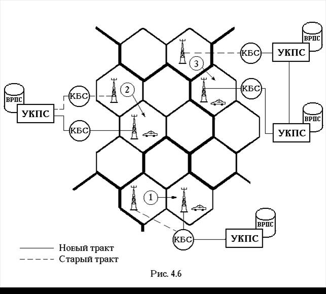 находится ПС, самостоятельно не может осуществить переключение вызова “новой” ПБС, он обращается к УКПС. УКПС передает запрос на переключение вызова КБС, который контролирует “новую” ПБС. После этого проключается тракт УКПС - КБС - ПБС и резервируется двухсторонний пользовательский канал, а ПС получает указание о переходе на новый канал. Старый тракт разрушается. Кроме того, ПС передается информация о смежных сотах. Аналогично, как и в предыдущем случае, если при смене сот изменяется и зона местонахождения, ПС после завершения обслуживания вызова должна получить доступ к сети и передать запрос на обновление данных зоны местонахождения.