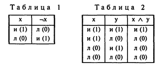 Для определения отрицания используется матрица (таблица) истинности, в которой в левой колонке даются два значения истинности ("истина" и "ложь") первоначального высказывания, а в правой колонке – его отрицания (табл.1). Истинность высказывания будет обозначаться буквой "и" или числом 1, ложь – буквой "л" и числом 0.