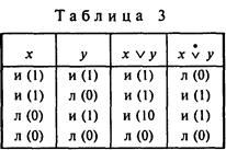 Учитывая принятые соглашения, мы можем построить таблицы истинности (табл. 3) для неисключающей (слева) и исключающей (справа) дизъюнкции.